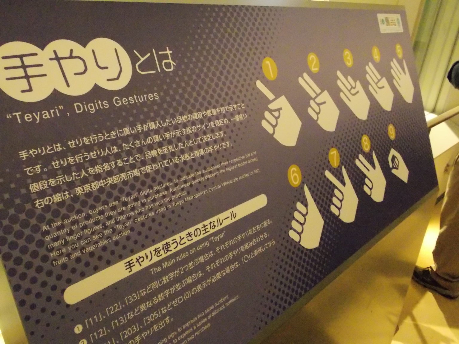 雖然不能到樓下工作區近距離體驗,但在見學台一旁也有鮪魚拍賣的手勢介紹,讓這個獨特的拍賣文化也成為具體化的知識。從親身體驗改成展覽式觀賞的觀光方式,就是築地遷到豐洲後,對觀光客來說最大的改變了。