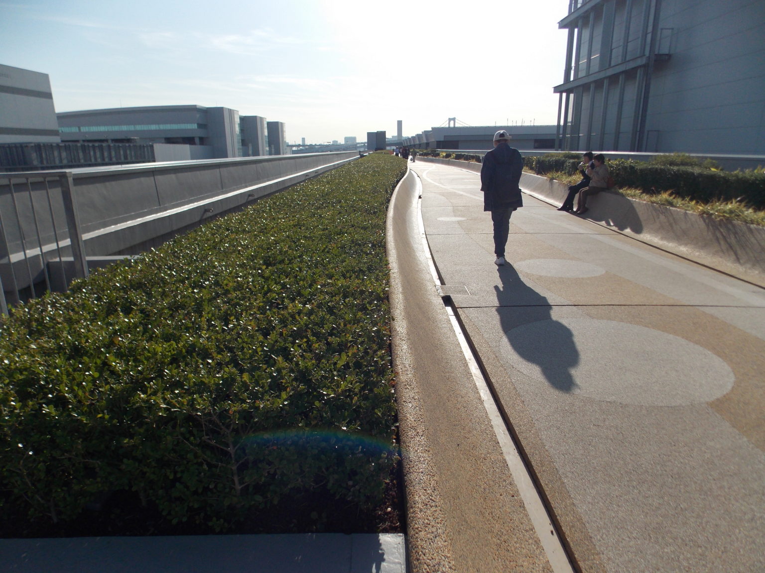 結束參觀後,不妨沿著連通道往回走,跟著指標來一趟屋頂綠化廣場,從六層樓高的屋頂望向東京和台場,都是相當愜意的景致。綠化區也非常適合散散心,再往上走也有大片的人工草原,乾淨到可以躺著在上面翻滾,或是坐下來稍作休息,享用剛才堆積在手上無法邊走邊吃的食物,但請千萬要把垃圾帶走,不要隨手丟棄也不可以丟在廁所垃圾桶。如果還有體力的話,可以搭電梯下到一樓的豐洲公園,同樣可以享受遼闊的風景,更近距離地觀賞河岸風景。