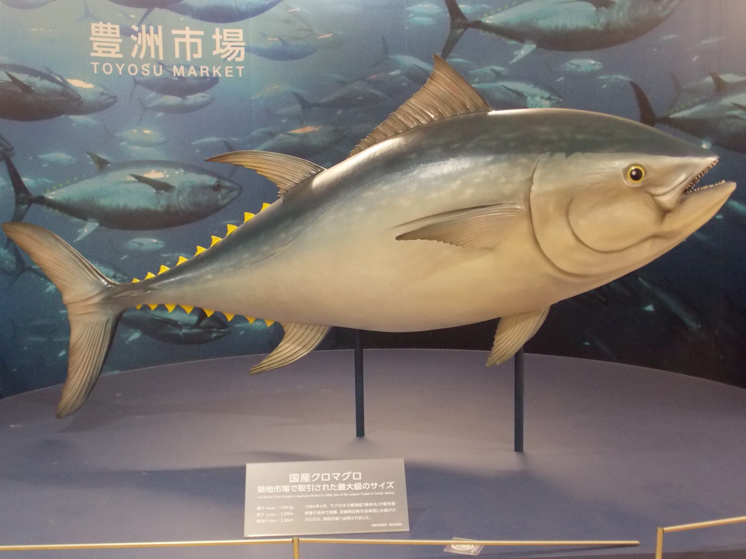 在進入主要參觀區之前,會先來到豐洲市場歷史簡介區,再往前就會見到這條曾在築地市場成交過,最大的黑鮪魚一比一模型,頗有博物館或觀光工廠的氣勢。