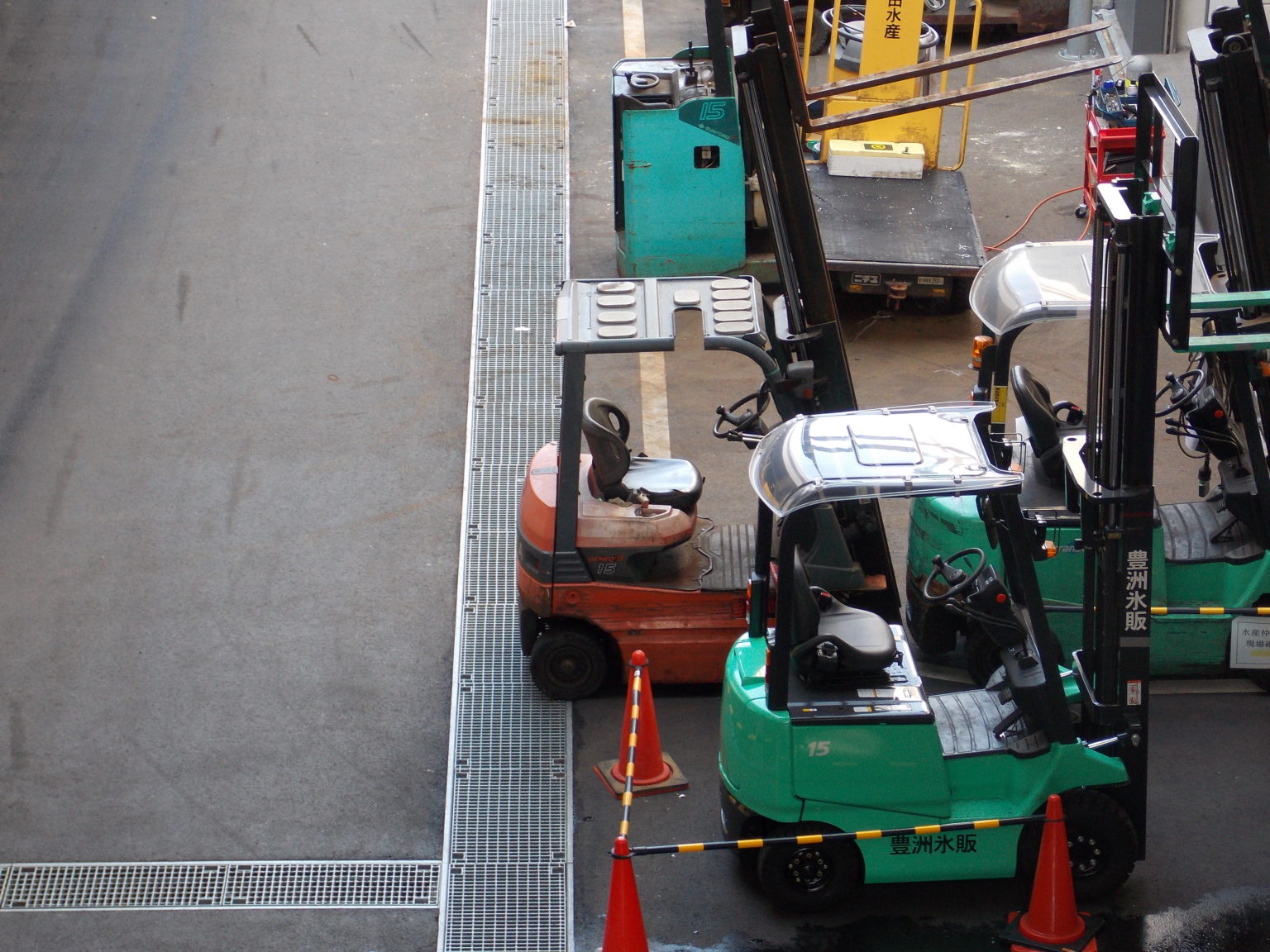 離開水產批發區後,沿著連通道前往水產中盤銷售區,沿途向下俯勘,發現從前築地場內最有名的風景之一:工作用台車,現在已經打上豐州的新名字。分隔工作與參觀區的另一個好處,便是讓當時隨時在場內忙進忙出的台車,和四處亂逛的觀光客不會再有碰撞的危險。