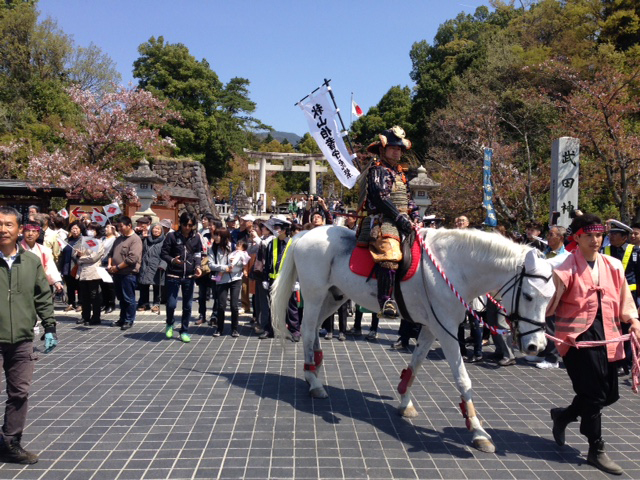 由自願者申請抽選的24位武將浩浩蕩蕩地走在總數有400人的遊行隊伍中,24位武將騎馬經過飄著櫻花的街道,戰國時代的凜然之氣與柔美的櫻花互成對比,彷彿回到了戰國時代的熱血情懷中,對武將愛好者來說,是難得一見的年度盛會,整個遊行會有多達1600名的人員參與,十分壯觀,想參觀也得趁早卡位哦!