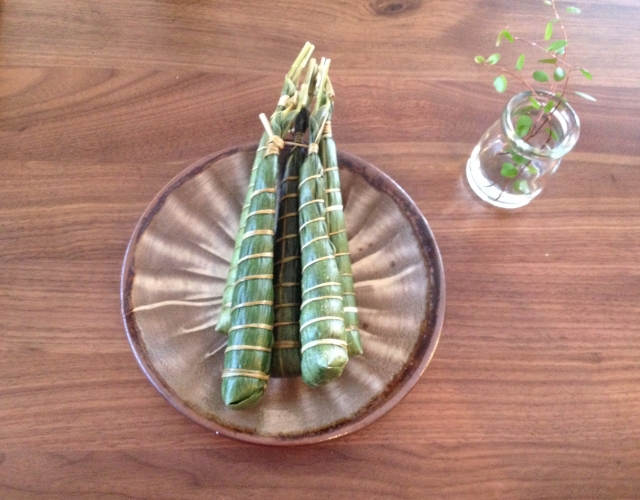 首先,這個粽子包在叫「笹」(ささ)(音sasa),的葉子中。這個形狀為了讓毒蛇害怕,藉此可以達到免疫、防止生病與災難。使用「笹」這個葉子,也有避邪的效果。