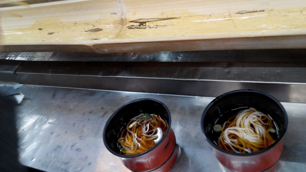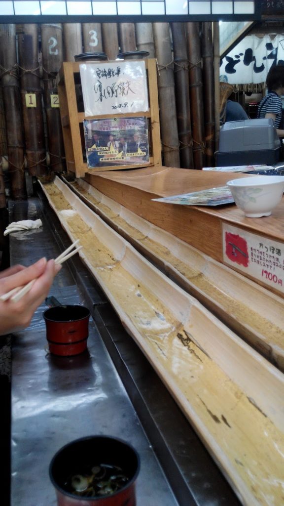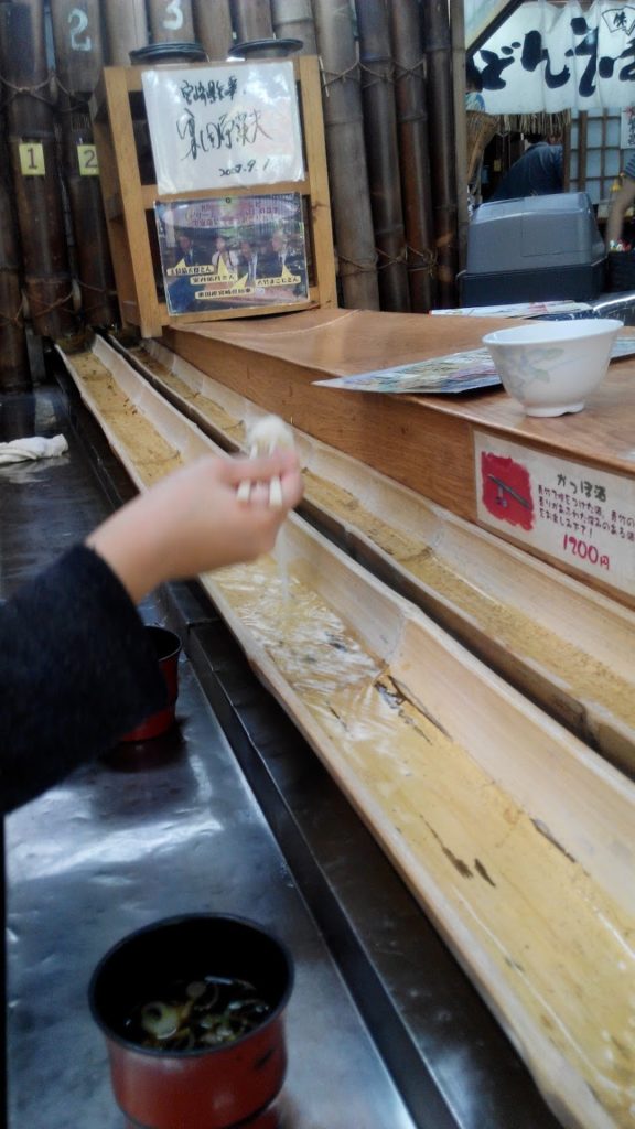 這種吃法非常有趣,店員會在「竹橋」的盡頭看客人是否有準備好再放麵條,不過也很難避免有漏網之魚,所以要非常專心看麵條什麼時候流下來,而且也需要基礎的拿筷子技功。每個地方吃流水麵的規矩都可能會有一點不同,像我在高千穗峽的時候最後一團麵條是店員從後面跟我說的,但在有些地方,最後一團麵會用紅色素麵表示,看到它出現就代表那是最後了。