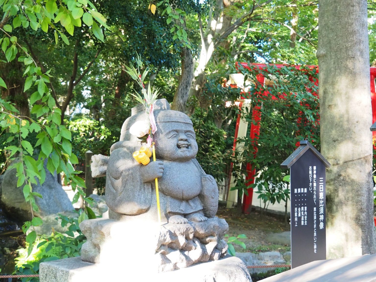 神社內還有著一尊圓潤可愛的惠比須神像,頭上戴著烏紗帽、身穿古時的狩衣,右手拿釣竿、左手抱鯛魚,就像是古時的老爺爺和藹溫柔的笑容和造型。