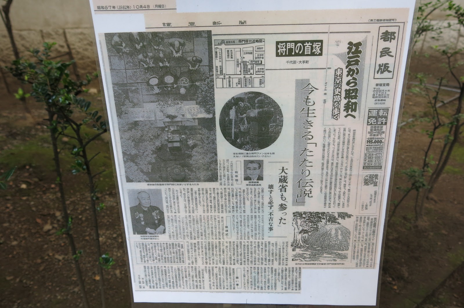 在墓碑左側樹上,被人張貼著一則昭和時代的新聞報導,敘述著在昭和時代因為想要遷移首塚而發生一連串的作祟,讓政府大臣也投降的事蹟。看起來,這些並不只是傳聞,而是確有其事,能夠作祟讓政府也屈服的,大概也只有平將門做得到了吧。