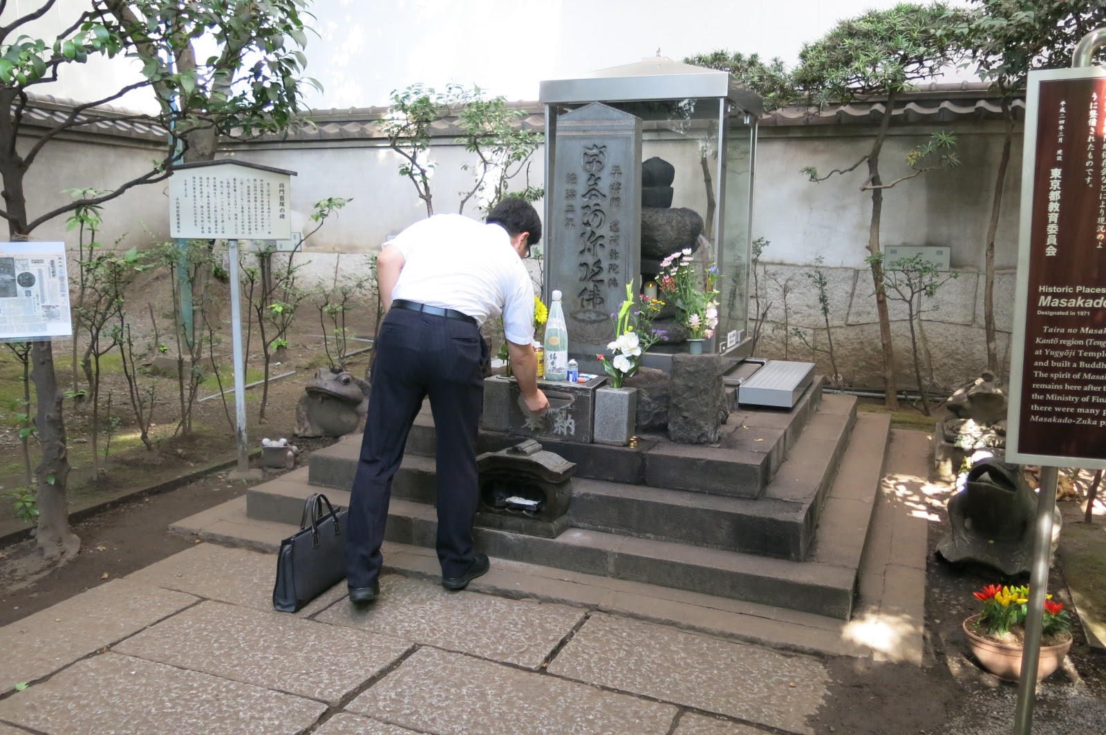 雖然說小心翼翼的來到了這裡取材,小編覺得最新鮮的還是在拍照的過程,不斷有三三兩兩的日本人進來參拜,經過小編厚臉皮的詢問,其中一名年輕上班族是因為離鄉來到了大手町上班,因此特別來這裡參拜,祈求平將門給他順利的好運。而另一位年紀西裝筆挺的大叔,則表示因為出差難得經過這裡,他曉得大手町平將門首塚是很有名的,因此特別繞路來到這參拜。可見平將門在日本人心中的知名度與重要性。