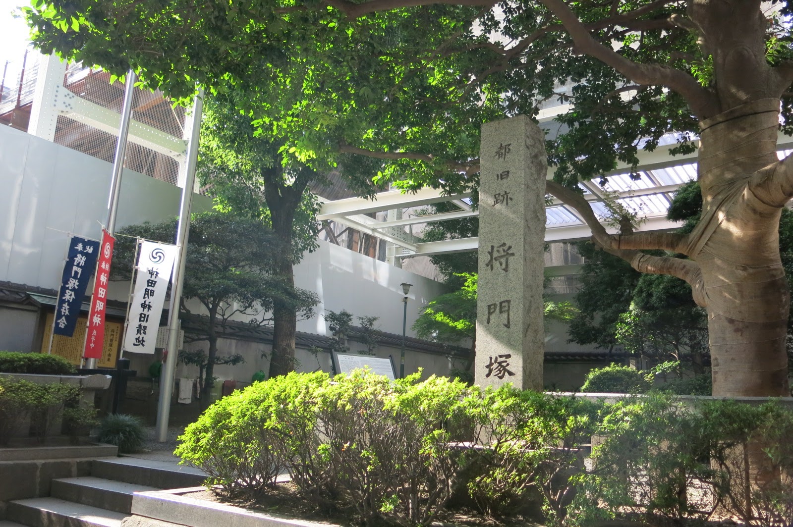 在首塚外插著的旗幟,是神田明神神社遺址的標誌,在過去這裡尚未開發之前,首塚這附近有著供奉平將門的神社,但隨著時代變遷,神社也得因為國家的開發而搬家,但唯獨首塚留了下來。