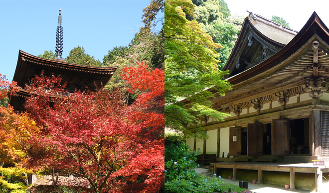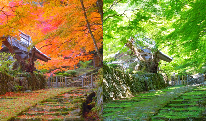 本堂也是鎌倉時期的代表建築物,被列為國寶。在通往本堂的參拜道上有守護大家的「千躰地蔵」,在金剛輪寺內部也有日式庭院、秋天時還有「血染的楓葉」可以觀賞,能夠感受到四季的變化。