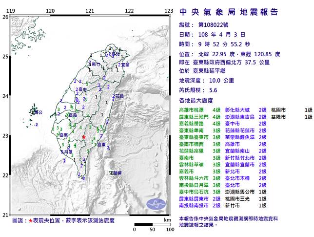 各地最大震度:高4 屏4 嘉4 東3 南3 花3 雲3 投3 中3 彰2 澎2 苗2 宜2 竹2 北2 桃1。
