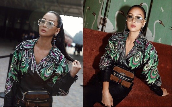 鏡頭來到米蘭現場,孫芸芸一樣穿了皮質上衣與皮裙,華麗的圖樣與鑽飾超搶眼!搭配不斷延燒的腰包與梳乾淨的馬尾造型,充滿個性時尚~