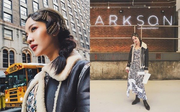 復古油頭髮夾造型也超搶眼!用率性的羊皮外套中和長洋裝的仙氣,展性迷人的東方味氣息~