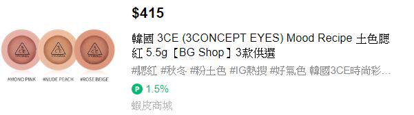 3CE的Mood Recipe可說是土色腮紅的平價代表! 霧面的質地可以畫出柔柔粉粉的感覺,加上它超級顯色!在妝感、顯色度上都無可挑惕。