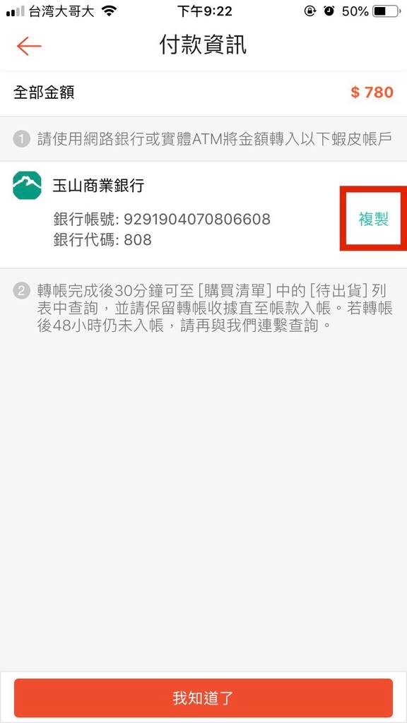 方便的是,轉帳帳號跳出來可以直接點選複製鍵複製