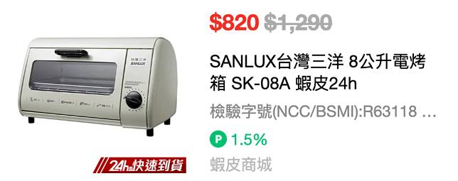 我最想買小烤箱做簡易料理,我購買「SANLUX台灣三洋 8公升電烤箱 SK-08A 」,看了一下商品規格我就決定購買。