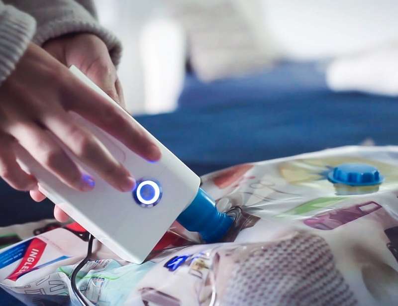 如果覺得手動壓縮實在太花時間,市面上還有全自動的真空壓縮機可供選擇,相較於手動抽風更加倍省力快速。不僅機身外型風格簡約、俐落有型,大小約與行動電源差不多,重量也只有400g十分輕巧。除了居家使用,它也可以跟隨你前往世界各地,幫你的行李箱節省空間。