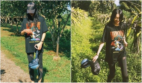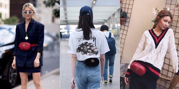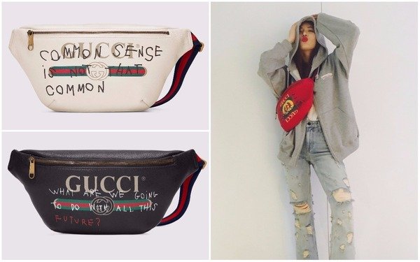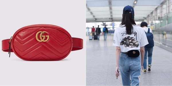像是國際蔡和楊冪就將GUCCI腰包斜背,讓包包正好卡在肚子前方。因為包款上有西班牙年輕藝術家 Coco Capitán的手寫標語,極具塗鴉隨性風格,她們都用鴨舌帽、素色上衣做搭配,讓包包成為造型重點,超吸睛。