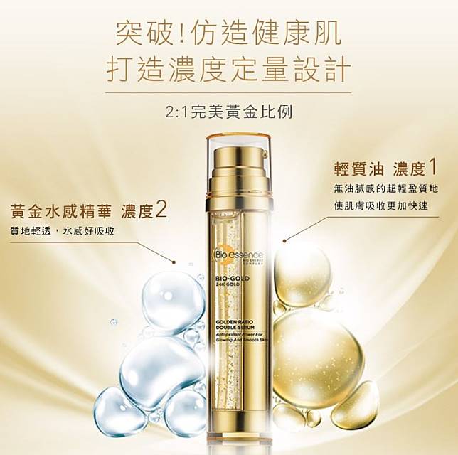 想要防止皺紋冒出的人看過來~用過這款Bio-essence金萃黃金比例雙精華的人都說讚!它分成左右兩管,左邊是凝露狀的黃金水感精華,裡面還有細細的金箔;右邊則是輕質油,一擠壓出來的份量就是精華2、輕質油1的親膚比例!仿造健康肌膚油水平衡狀態,給予肌膚無負擔的深度滋養,使肌膚光澤透亮,能有效延緩細紋發生~