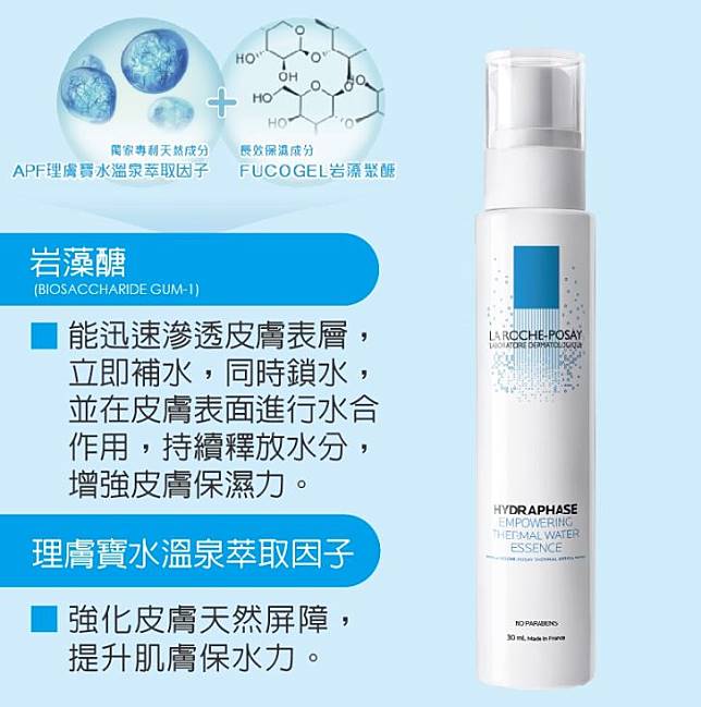 理膚寶水採用溫泉水及岩藻聚醣,為肌膚補充大量水分,特殊的分子結構還可讓皮膚表面進行水合作用,增加皮膚的保濕力;質地清爽好吸收,比較適合想要維持肌膚保水度的人~