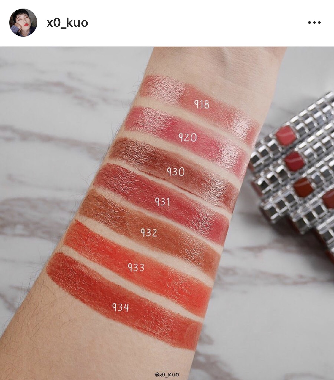 #930是帶紅棕調的補血中藥色系。一般來說偏深的中藥色唇彩會比較挑妝,需搭配完整妝容才不會顯得突兀;但由於這款的質地是水潤帶些微透明感,讓中藥色系也能輕鬆駕馭~喜歡橘棕色調妝容的人很適合收這個色號,搭配起來非常好看!