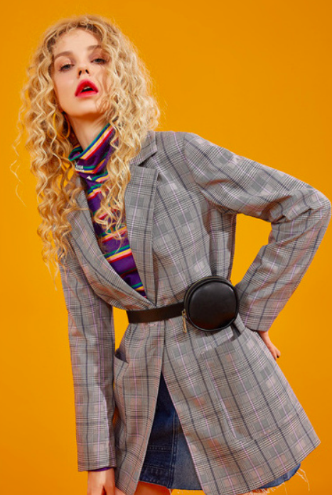 Model展示了今年最趨勢的小腰包使用示範!同時是皮帶功用與小包包功能的結合,若是你的西裝外套沒有附腰帶~就可以使用這種方式繫出腰身,實用又很有型!