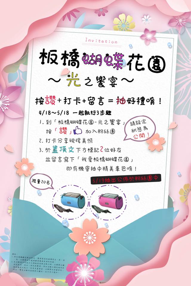 除了夢幻美景,即日起更有精美禮品抽獎活動!只要到《板橋蝴蝶花園-光之饗宴》粉絲專頁按讚、至板橋公園現場拍照打卡、並在粉絲專頁的貼文下方留言「我愛板橋蝴蝶花園」+標記2位好友,就有機會獲得限量20組的獨家好禮。