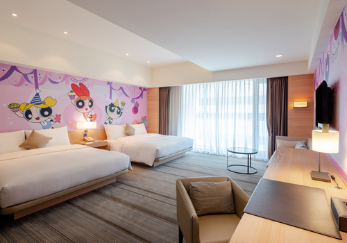 「一天又平安的過去了,感謝飛天小女警的努力」想必許多7、8年級生都對這句話有著共同回憶吧~小編還記得國小配飯的卡通首選就是飛天小女警呢!這次聯名主題房以粉紫色為主色調,夢幻爆表、萌度爆棚啊~讓花花、泡泡與毛毛三位可愛的小女警守護著你渡過安心的一夜吧!