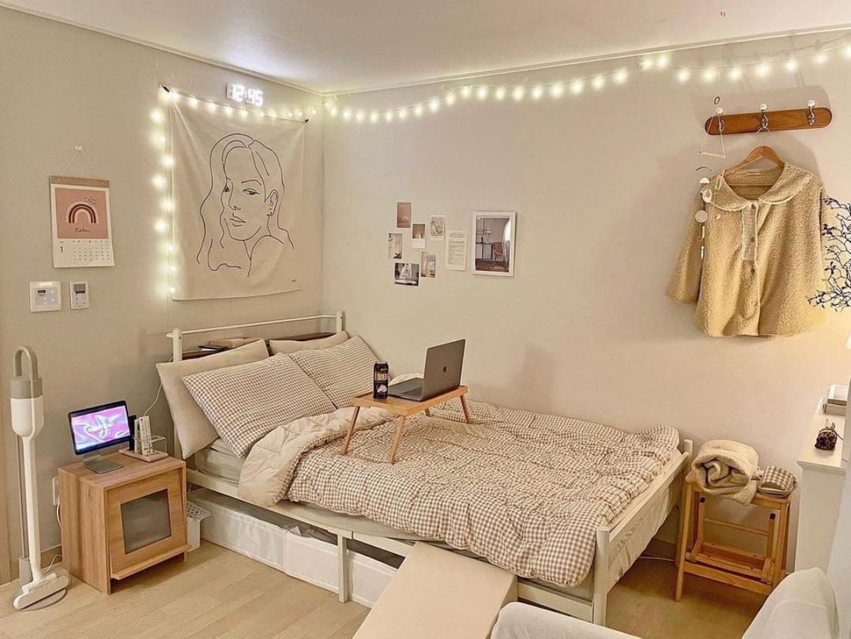 燈光是營造氛圍的重要角色!在牆上掛上燈串,或是在架上放上造型小夜燈,能提升房間在夜晚的質感,也能提升睡眠品質。