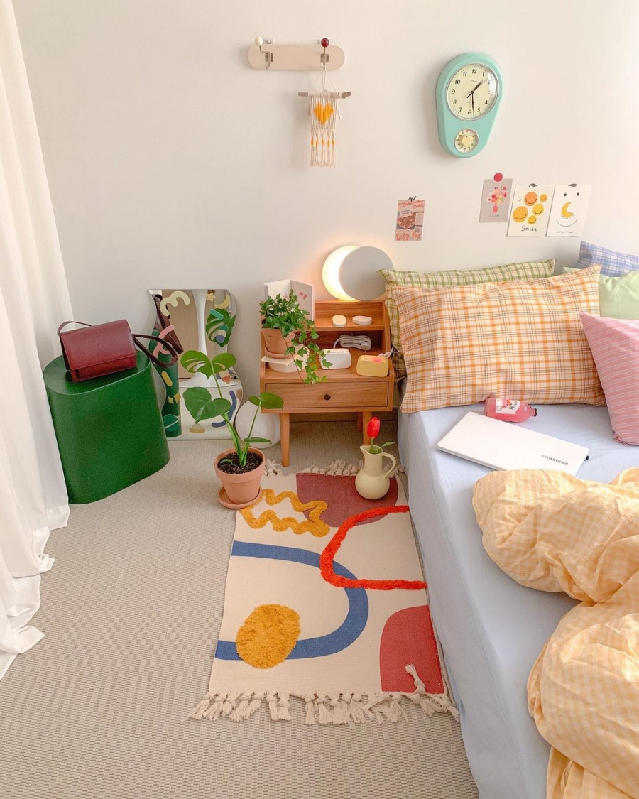 在房間擺放地毯可以讓空間有區塊感,使視覺空間擴大。在小空間裡也可以運用腳踏墊來達到這個效果,選用一個繽紛跳色的腳踏墊來裝飾臥室吧!