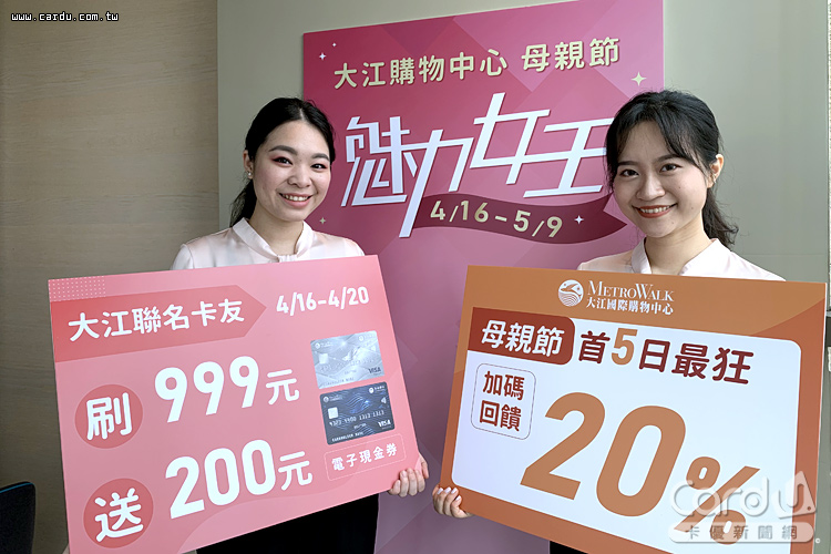 同時強打信用卡福利,自4月16至20日「魅力女王」首5日,玉山大江聯名卡友消費滿999元送200元電子現金券,回饋率超過20%。並攜手玉山、花旗、聯邦、華南、國泰世華、遠東商銀...等14家銀行,力推「銀行刷卡滿額禮」大送電子現金券。