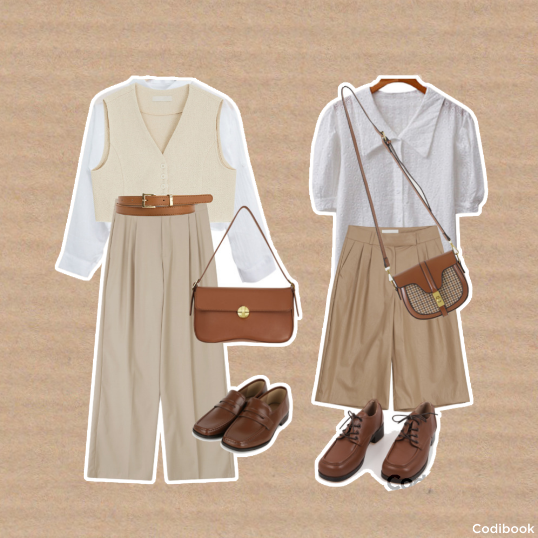簡約的米色配駝色系穿搭,配上俐落又圓潤的剪裁線條,再佐以些許皮件,日常穿搭也可以很有質感!