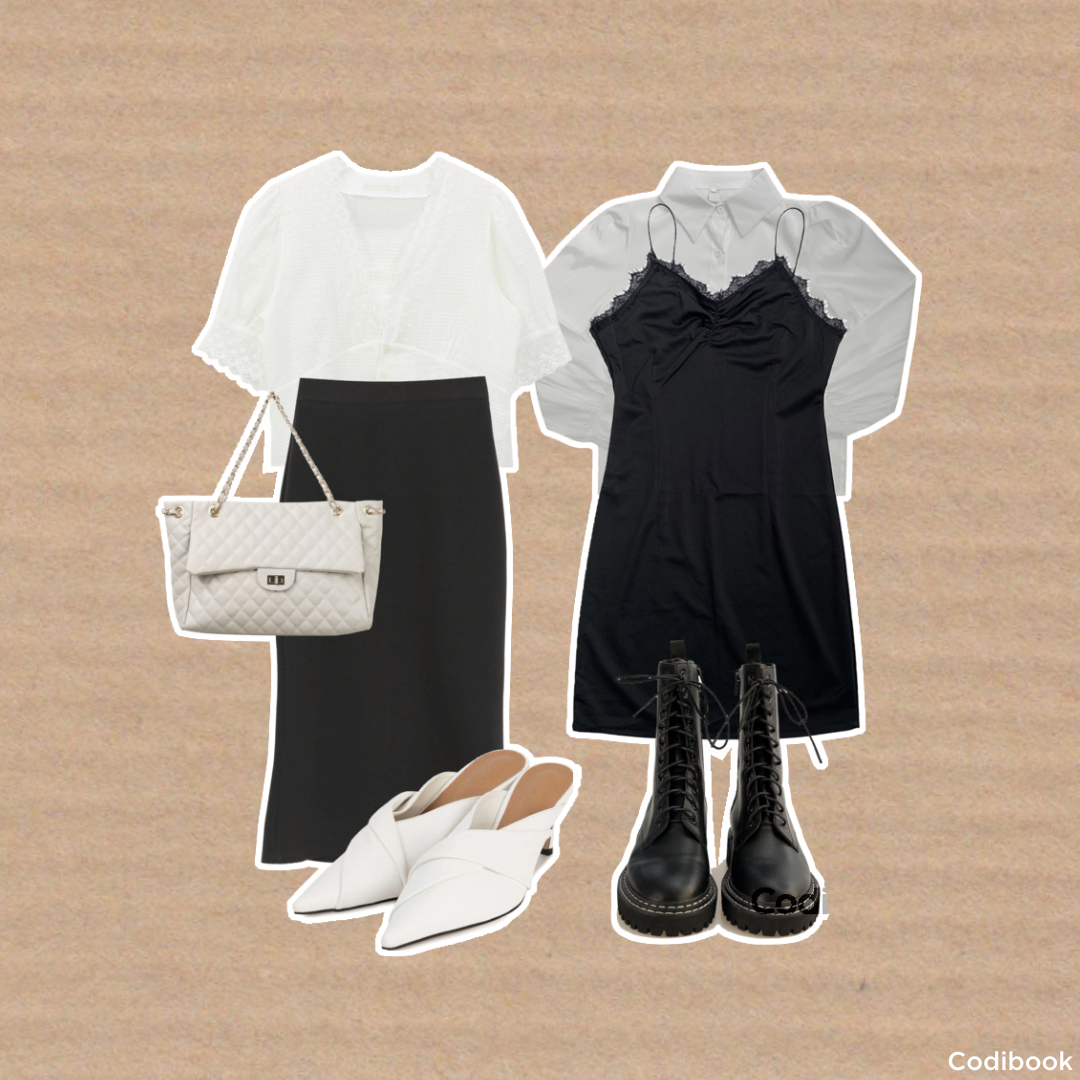 好像韓劇《Penthouse上流戰爭》中的貴婦跟千金小姐穿搭,簡約的黑白穿搭,媽媽用修身的中長洋裝強調優雅感,女兒則是睫毛蕾絲的洋裝帶有一點小性感,卻搭馬丁靴創造衝突又平衡的時髦感,穿這樣一起去百貨公司逛逛再喝個下午茶如何呢?