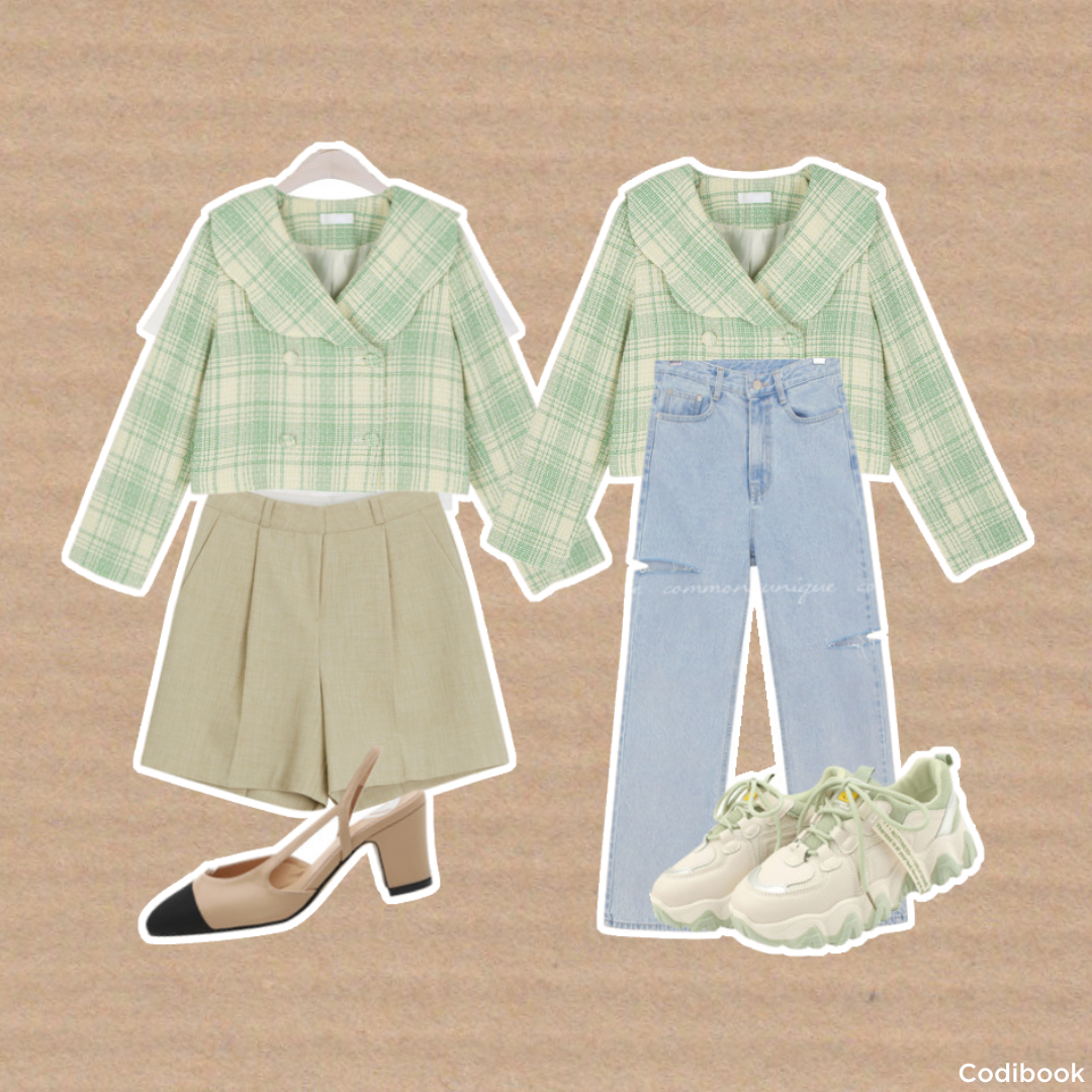 有點日本鹽系風格的簡約穿搭,因為格紋已經是黑與白,就用一點藍色跟米色單品增添色彩感~