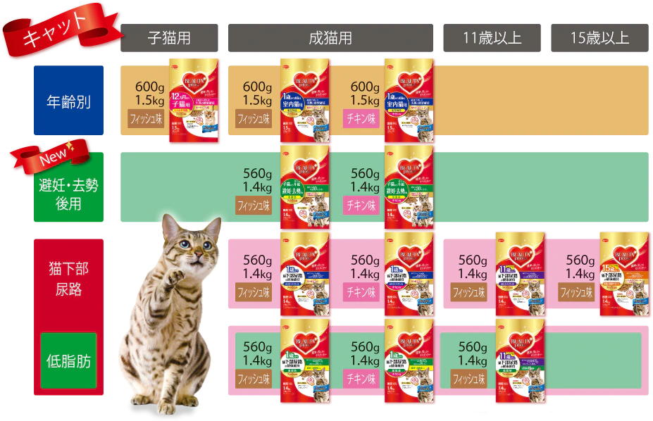 幼貓、成貓、高齡貓都有專屬飼料,雞肉、海鮮風味也能滿足挑食的貓咪,大包裝中再分裝小袋,不易受潮更能保持飼料新鮮。