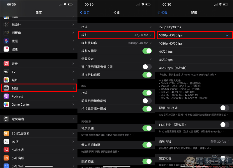 也能前往設定的「相機」設定錄影規格,以這次要製作停格動畫影片錄製來說,其實只需要 1080p HD 30fps 就足夠了。設定完成後,就能自行拍攝一段影片囉!