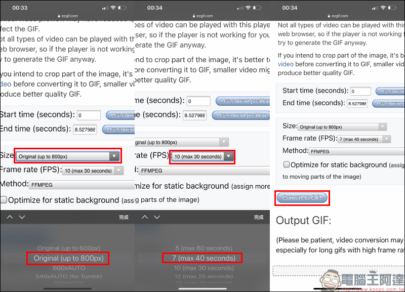 點選 Size 可選擇 GIF 的解析度的大小,這裡尺寸建議選擇「Original(原始,最高 800px)」。另外也能設定影格幀數,這步驟也是本次要製作停格動畫最關鍵的步驟,為了讓以影片製作的停格動畫的看起來更像是傳統用多張照片拼接而成的效果,因此影片幀數更低會更相似。如果不確定幀數該設定多少,可先設定 7fps 後點選「Convert to GIF(轉換為 GIF)」: