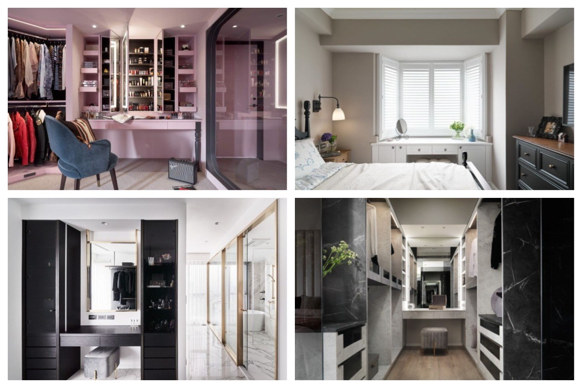 如果有足夠大的使用空間,將梳妝台和更衣間一起規劃,可以連同當日的衣著配件一起穿搭,是非常聰明的設計方式,走進更衣間也變得很有氣場!但更衣間內的梳妝台,特別需要注意燈光和材質選擇,若自然光不足的情況下,需要增加補充燈光、燈帶,以及盡量避免會反光的檯面材質。