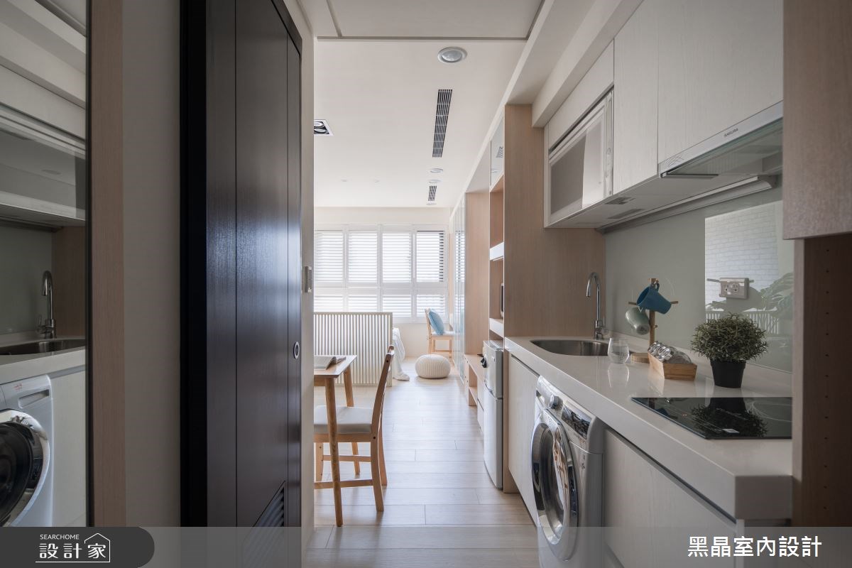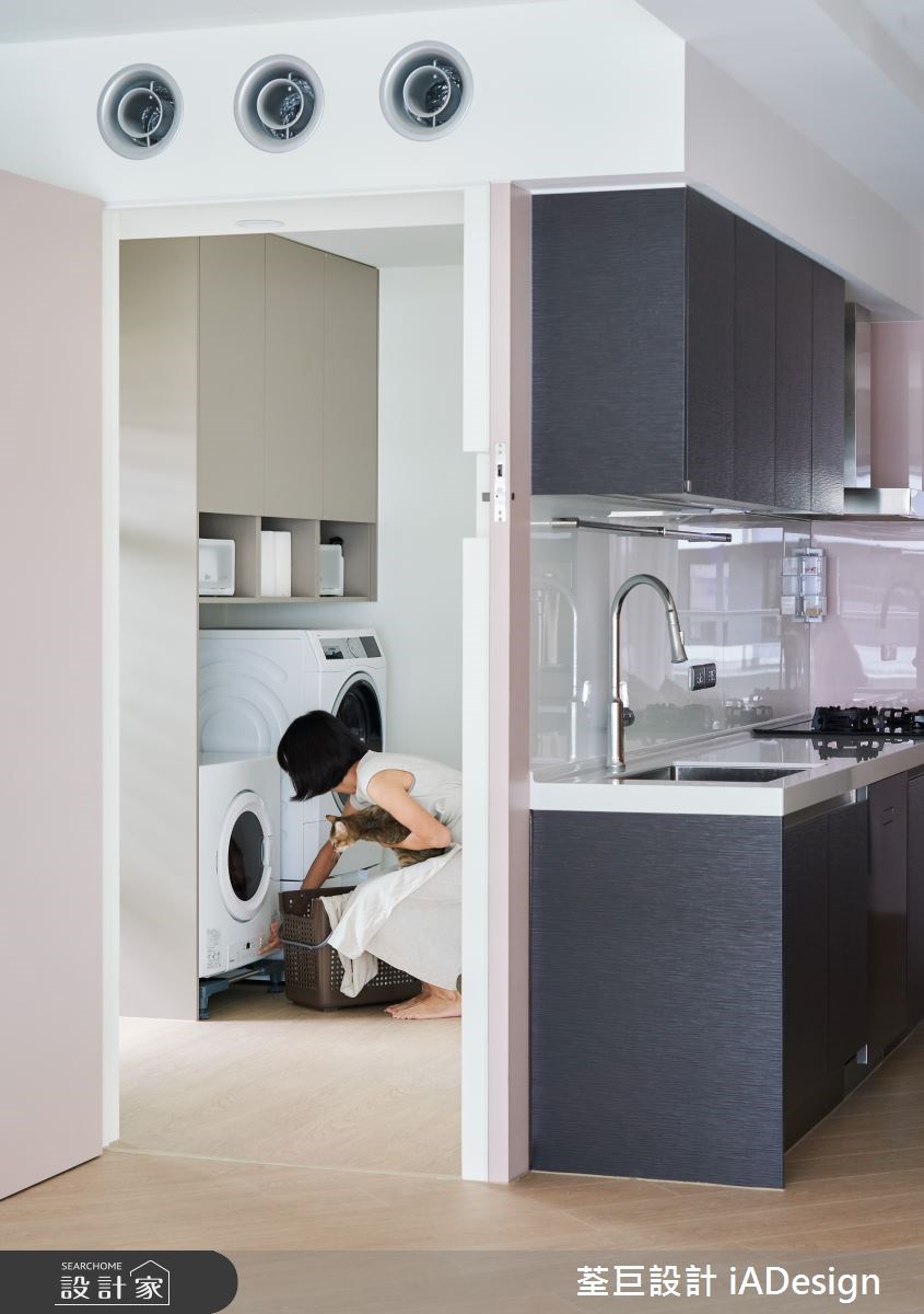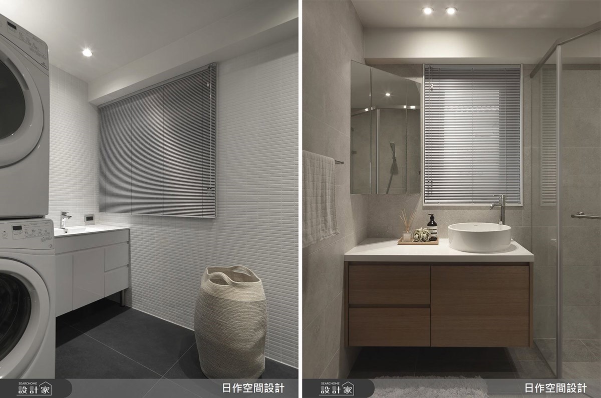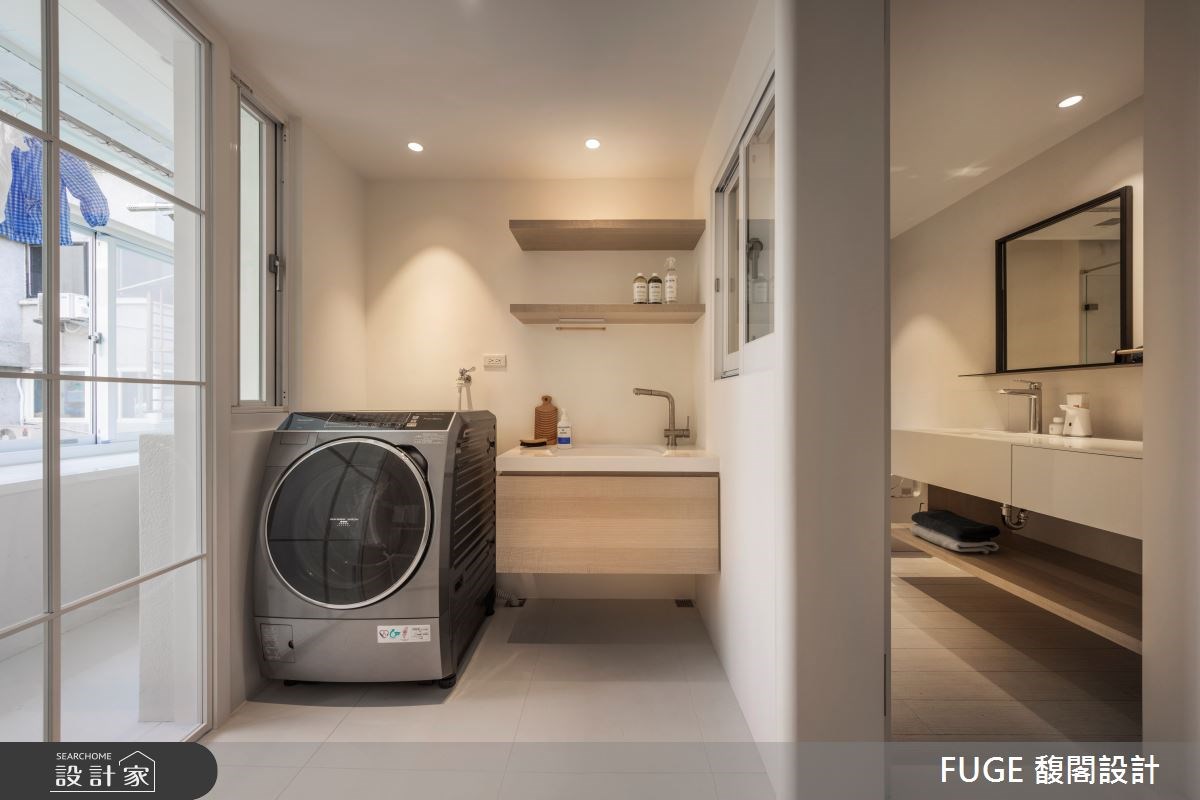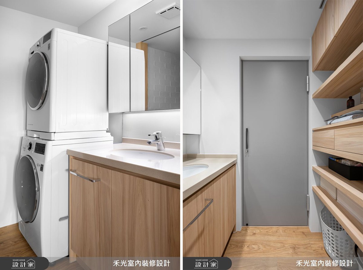 因應狹小空間衍伸出的設計手法,同時也考量到使用上的排水與用電規劃,常常將洗衣機、烘衣機規劃在浴室空間的乾區,最大的好處除了是洗衣機的排水與電路規劃上面不用特別費工,洗澡前換下的髒衣服也可以直接丟到洗衣機內;洗衣精直接存放在浴櫃中,洗完澡直接開啟按鈕洗淨衣物,使用上更為順手;同時將洗衣機放在室內也能避免電器受到日曬雨淋,電器壽命更長久也更安全。針對沒有陽台的住宅,空間允許下將工作陽台的機能移到室內,規劃可洗衣、烘衣以及燙衣、收納等多功能的家事間也是不錯的選擇。