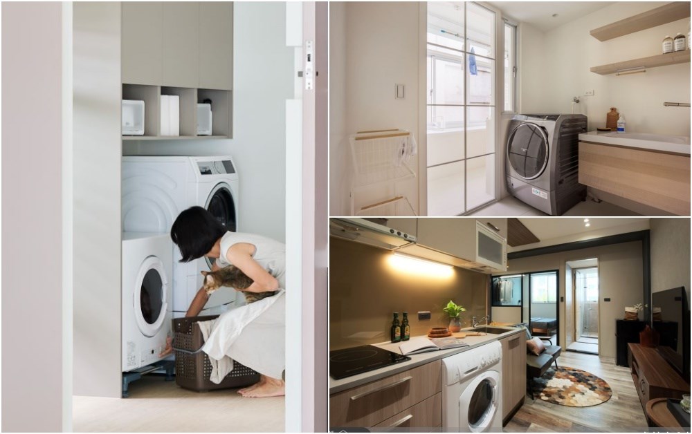 歐美在居家中因為開放式設計,很早就有跨場域混合的概念。,由於沒有華人的風水禁忌,時常在美式家庭中看到將洗衣機用鑲嵌式規劃在廚具下方,雖然在使用上似乎沒那麼符合台灣,但由於整合性可解決小坪數或套房中空間不足沒辦法放置大型家電的問題。不僅小坪數可參考,許多大坪數住宅也會將洗衣機整合在室內空間,增加設計的美觀性;撇除風水疑慮,在使用更有效利用有限的坪數達到最完備的生活機能,只需要注意洗衣機不要直接鑲嵌在瓦斯爐檯面方即可。