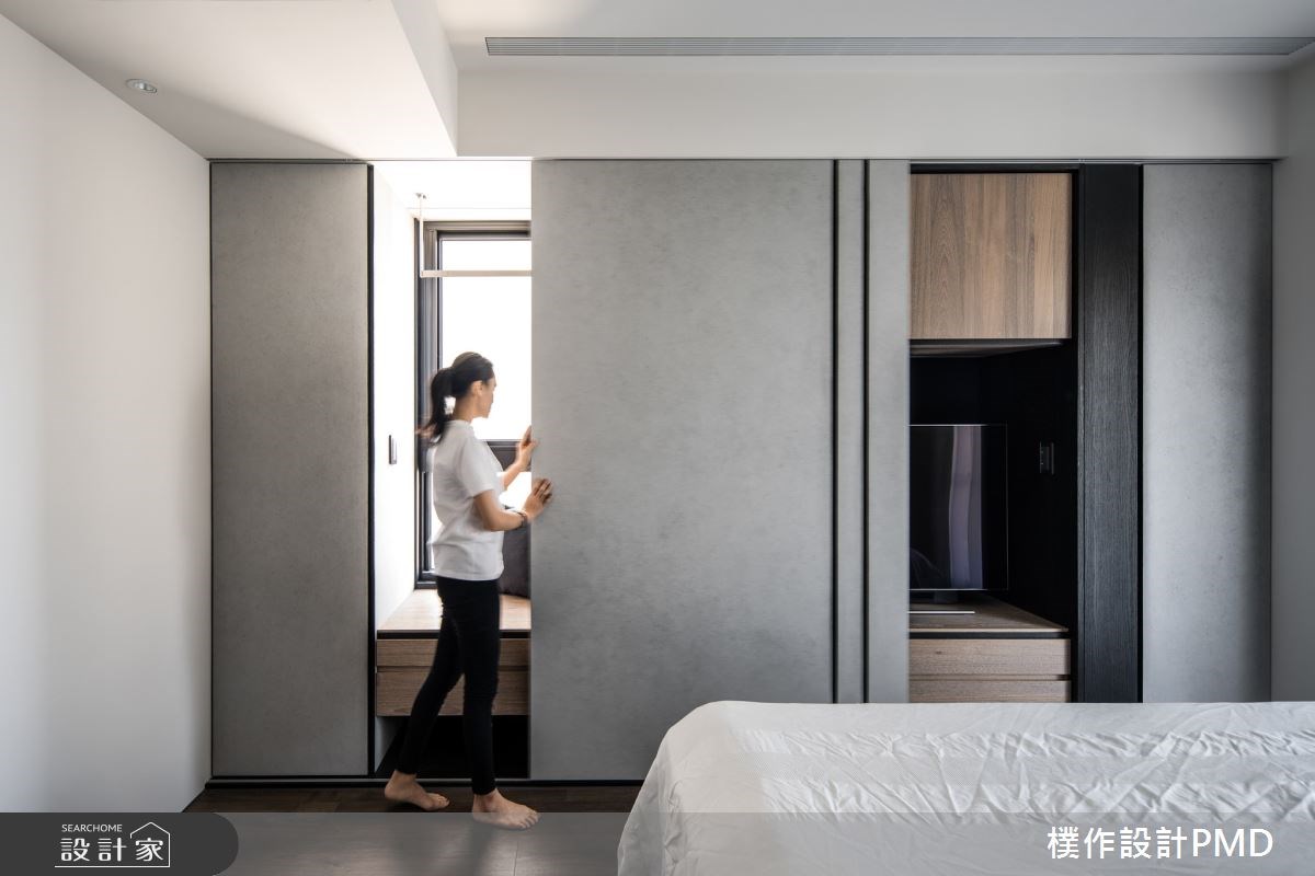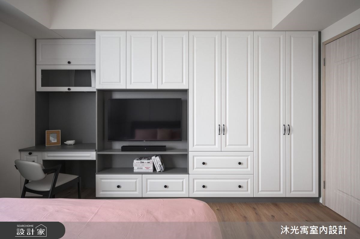 隨著現在看電視的頻率下降,電視牆變成有人需要、有人不需要的裝潢選項,這時候建議可以利用隱藏電視牆的方式,不觀看時就可以將電視藏進門片後方,化身為一般的收納櫃,而且房間使用隱藏電視牆,能夠避免鏡對床的風水疑慮喔!