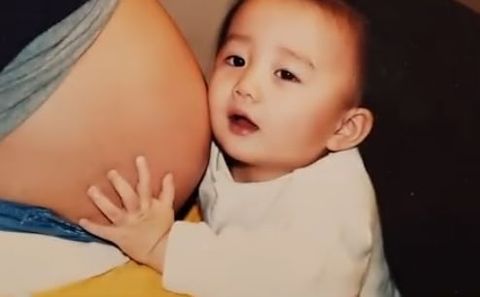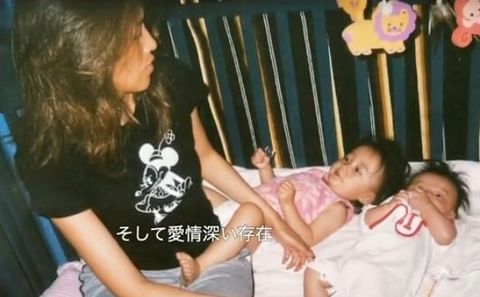 木村心美小時候,在媽媽懷孕時,貼在媽媽的孕肚上,傾聽妹妹光希的聲音。