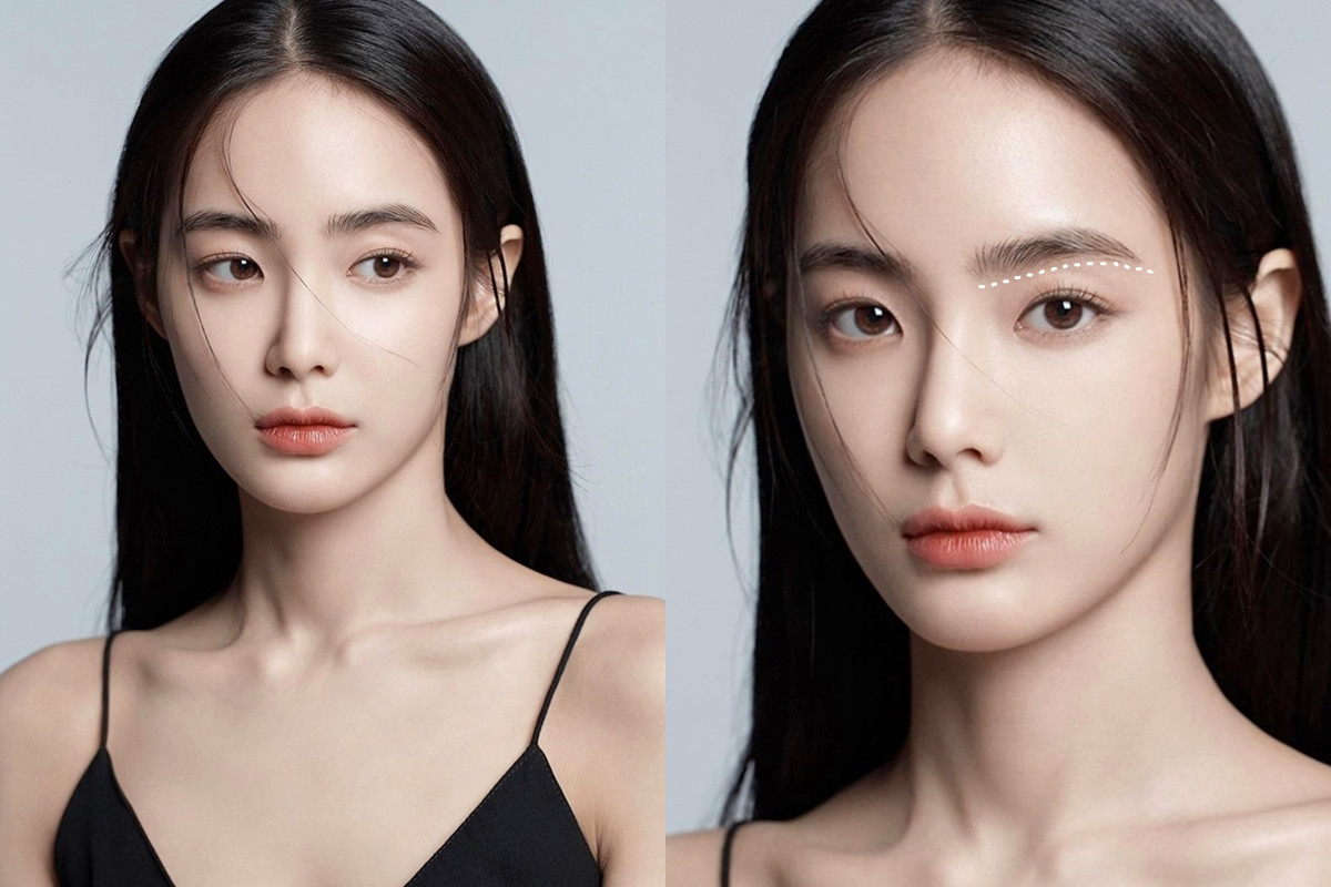 除了考慮「眉眼間距」之外,也可以看整個臉部的三庭比例、尤其是「髮際線位置」,髮際線比較高的話、多半都是臉部上庭位置較高,很容易給人一種髮際線禿的感覺,畫上稍微粗一點的眉型,可以在視覺上縮短眉毛到髮際線的距離、縮短上庭比例,以高允貞的照片為例,左邊粗眉的話上庭顯得比較短、看起來比較顯年輕、顯幼態,右邊的細眉型其實不是不適合她、但因為上庭稍微長了一點,看起來則相對較成熟。