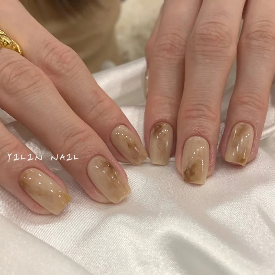 「烏龍拿鐵色」美甲款式推薦:烏龍拿鐵色x日系金箔
