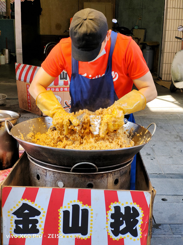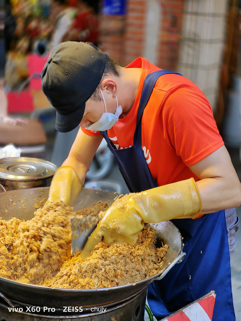 看到這雙刀火雞姐,喔不!是雙鏟麻鴨哥,正辛苦的做出有名的麻香鴨肉油飯,透過慢速快門,呈現雙手快速翻攪的畫面