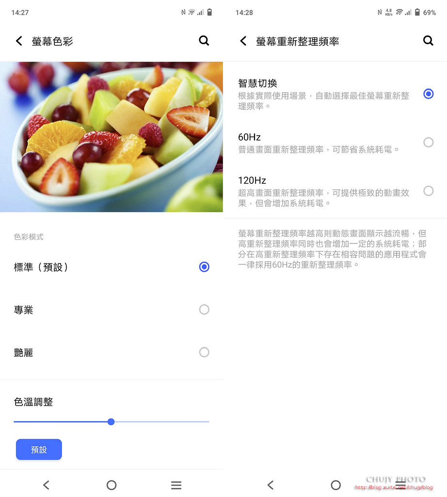 AMOLED 螢幕,提供解析度 FHD+ 2376*1080,120Hz 更新率、HDR10+。也可自行設定不同色溫,符合自己觀看的感覺。