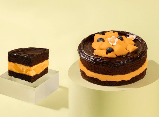除了鋪上滿滿新鮮芒果內餡之外,更在外層堆上新鮮芒果果塊,整顆蛋糕整整增加了「30%芒果果塊」,巧克力蛋糕體、生巧克力醬和芒果交織出酸中帶甜的美味,每口下去都是幸福,而且還能一解盛夏的酷熱呢!