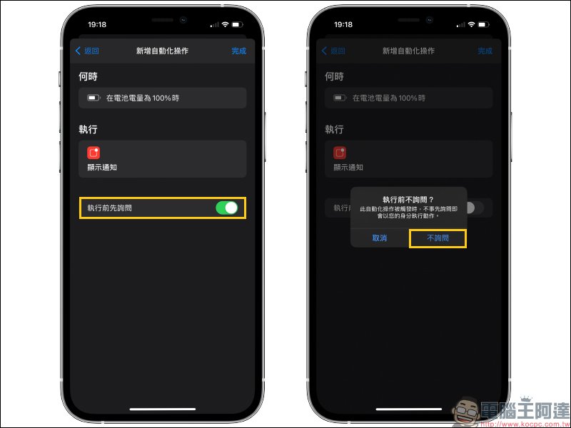 最後,記得把「執行前詢問」功能關閉,才能在達成指定條件(電池電量達到 100%)時推播提醒通知。