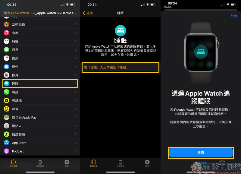 首先,在 iPhone 開啟 Watch App ,於「我的手錶」頁面點選「睡眠」。若為首次使用,需要先完成將官設定,才能啟用透過 Apple Watch 追蹤睡眠。開啟後,將可透過 Apple Watch 追蹤使用者的睡眠時數,並以靜音的觸覺回饋鬧鐘提醒起床。