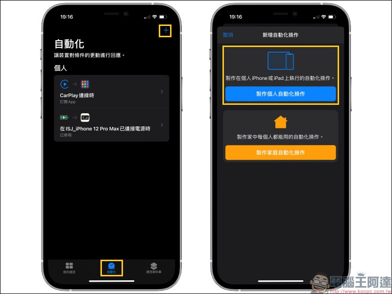 之前我們曾介紹過一招在 iPhone 充電時自動開啟翻頁時鐘顯示的方法,如果想於 iPhone 充滿電(或充電至指定電量)時推播通知提醒,則建議使用捷徑 App 的「自動化」操作功能。先點選右上角「+」新增自動化操作,接著選擇「製作個人自動化操作」進入下一步。