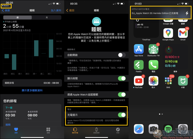點選啟用後畫面會暫時跳轉至「健康」App ,接著返回原本的 Watch App 開啟睡眠設定,這實在就能點選畫面上的「充電提示」並將它開啟即可。接著,當 Apple Watch 充電至 100% 時就會自動在畫面推播提醒通知,提醒用戶 Apple Watch 已充飽電。