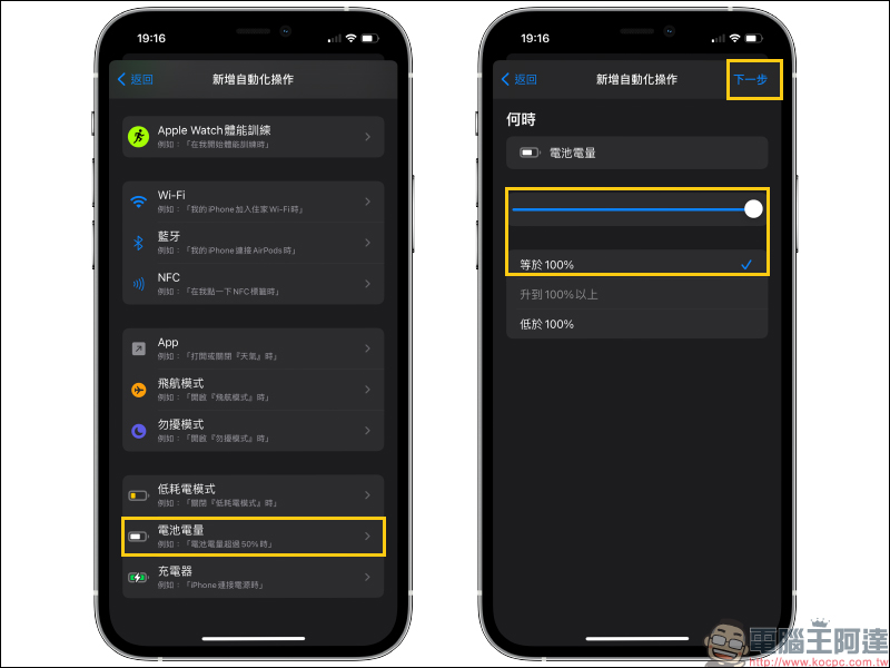 在「新增自動化操作」內選擇「電池電量」,並選擇想推播提醒通知的電量。以充電 100% 通知為例,就是選擇電量等於 100% ,選擇完就能點選「下一步」。